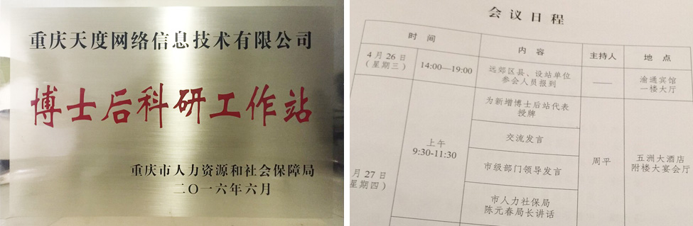 2017年4月27日,重慶市人力資源和社會(huì )保障局、重慶市博士后管理辦公室舉辦的“全市博士后工作會(huì )”在五洲大酒店召開(kāi),重慶市人社局陳元春局長(cháng)為“重慶天度網(wǎng)絡(luò )信息技術(shù)有限公司”等新增博士后站進(jìn)行了授牌。
