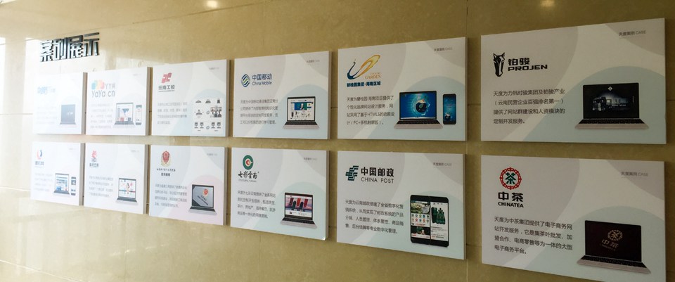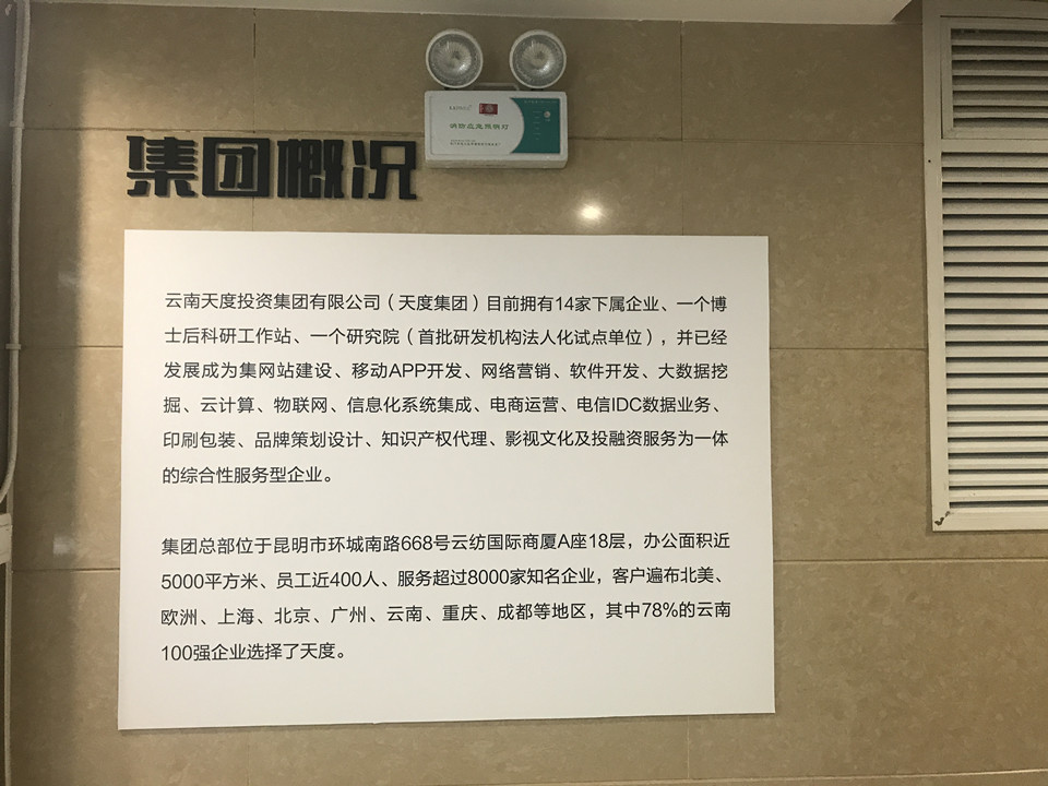 集團概況的文化墻對面就是咱們天度更詳細的“集團架構”,分別羅列出了重慶、昆明、成都三個(gè)總部的子公司,讓客戶(hù)對天度集團名下的子公司有更深入的認識,也從正面證明了天度12年積累下來(lái)的傲人的成果。