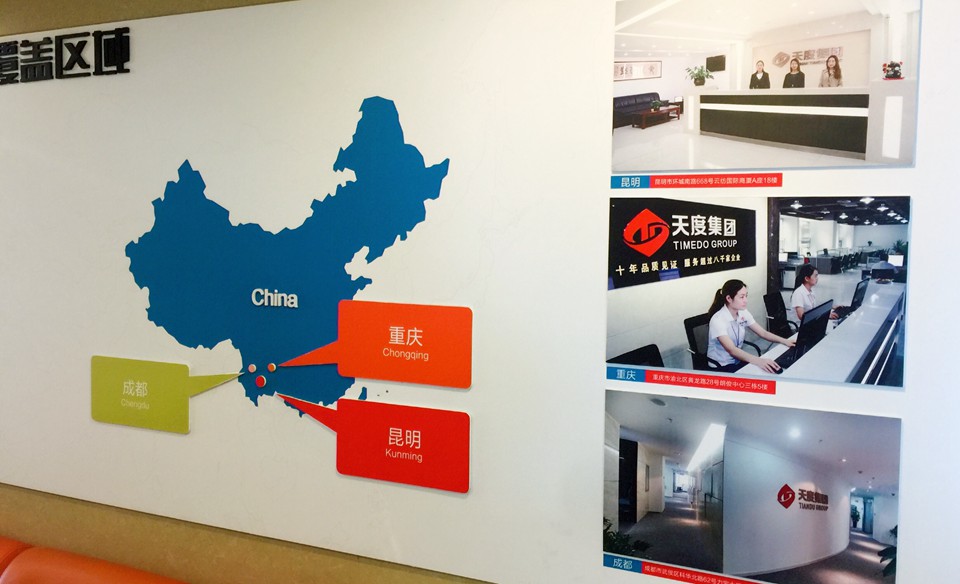 再往里走就到了“覆蓋區域”文化墻,主要內容是展示重慶、昆明、成都三個(gè)總部地址。