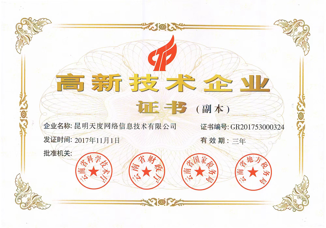 云南天度集團旗下云南蔚嵐信息技術(shù)有限公司、云南天度科技股份有限公司、云南天度軟件系統有限公司、昆明天度網(wǎng)絡(luò )信息技術(shù)有限公司、重慶天度網(wǎng)絡(luò )信息技術(shù)有限公司等5家企業(yè)獲得國家高新技術(shù)企業(yè)認定。