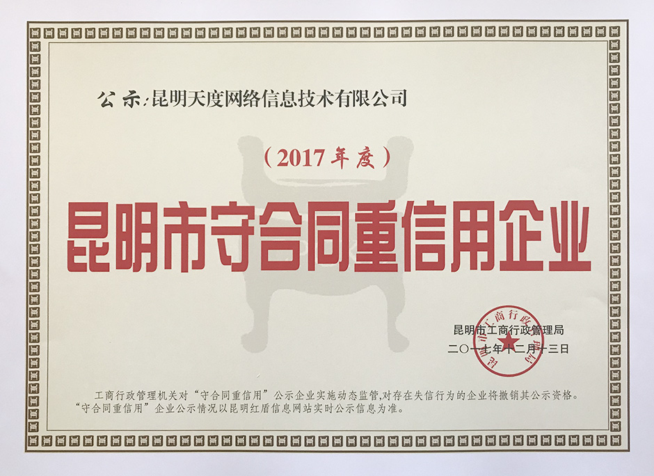 天度網(wǎng)絡(luò )公司被評為昆明市守合同重信用企業(yè)