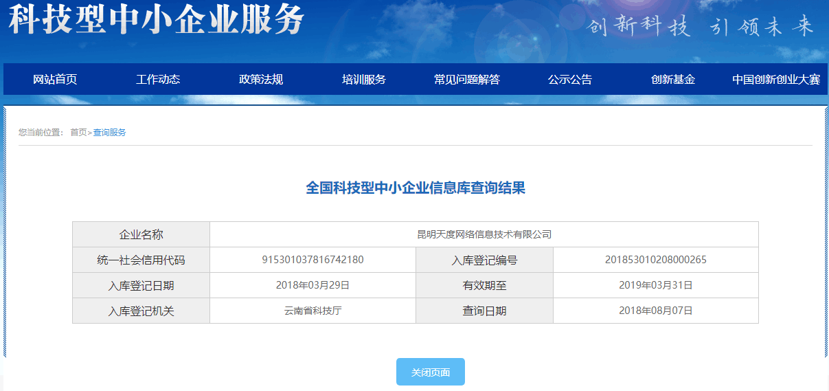 經(jīng)科技部門(mén)審核,確定天度符合科技型中小企業(yè)要求,3月29日,昆明天度網(wǎng)絡(luò )信息技術(shù)有限公司成功入庫登記成為2018年“全國科技型中小企業(yè)”!