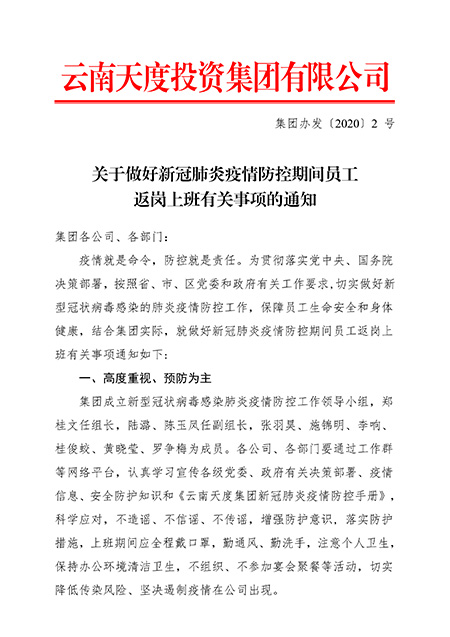 集團成立新型冠狀病毒感染肺炎疫情防控工作領(lǐng)導小組,鄭桂文任組長(cháng),陸潞、陳玉鳳任副組長(cháng),張羽昊、施錦明、李響、桂俊蛟、黃曉瑩、羅爭梅為成員。各公司、各部門(mén)要通過(guò)工作群等網(wǎng)絡(luò )平臺,認真學(xué)習宣傳各級黨委、政府有關(guān)決策部署、疫情信息、安全防護知識和《云南天度集團新冠肺炎疫情防控手冊》,科學(xué)應對,不造謠、不信謠、不傳謠,增強防護意識, 落實(shí)防護措施,上班期間應全程戴口罩,勤通風(fēng)、勤洗手,注意個(gè)人衛生,保持辦公環(huán)境清潔衛生,不組織、不參加宴會(huì )聚餐等活動(dòng),切實(shí)降低傳染風(fēng)險、堅決遏制疫情在公司出現。