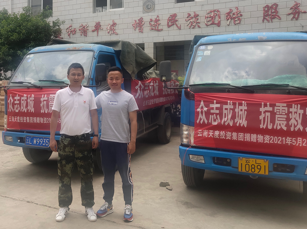 5月24日,集團董事、云南天度大數據產(chǎn)業(yè)發(fā)展有限公司總經(jīng)理施錦明代表集團向大理漾濞彝族自治縣平坡鎮人民政府副鎮長(cháng)左騰川完成救災物資捐贈交接,并于當日順利把大米發(fā)送到災區群眾手中。