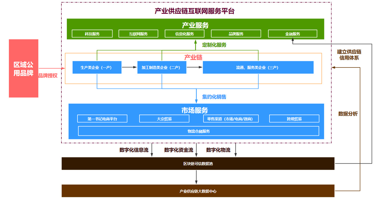 數字化供應鏈服務(wù)平臺應立足區域傳統產(chǎn)業(yè)、優(yōu)勢產(chǎn)業(yè)及重點(diǎn)支柱產(chǎn)業(yè),將電子商務(wù)將與發(fā)展需求充分結合,建立線(xiàn)上線(xiàn)下一體化的服務(wù)體系。平臺將區域品牌化體系建設為產(chǎn)業(yè)標準入口,服務(wù)于供應鏈內各企業(yè)主體,貫穿產(chǎn)業(yè)鏈從生產(chǎn)端、加工制造端、流通端全鏈條,以提升供應鏈各主體協(xié)同效率。同時(shí),平臺以數字化為核心手段及時(shí)獲取供應鏈信息流、物流、資金流等數據,并基于區塊鏈技術(shù)建立一套產(chǎn)業(yè)可信數據池,應用大數據分析技術(shù)對供應鏈進(jìn)行動(dòng)態(tài)分析,最終實(shí)現智慧化供應鏈系統,成為基于數字化供應鏈的集約化、智能化、創(chuàng )新性的開(kāi)放式產(chǎn)業(yè)生態(tài)平臺,以市場(chǎng)化、數據化、智慧化的運營(yíng)方式促進(jìn)產(chǎn)業(yè)升級,創(chuàng )造價(jià)值與財富。