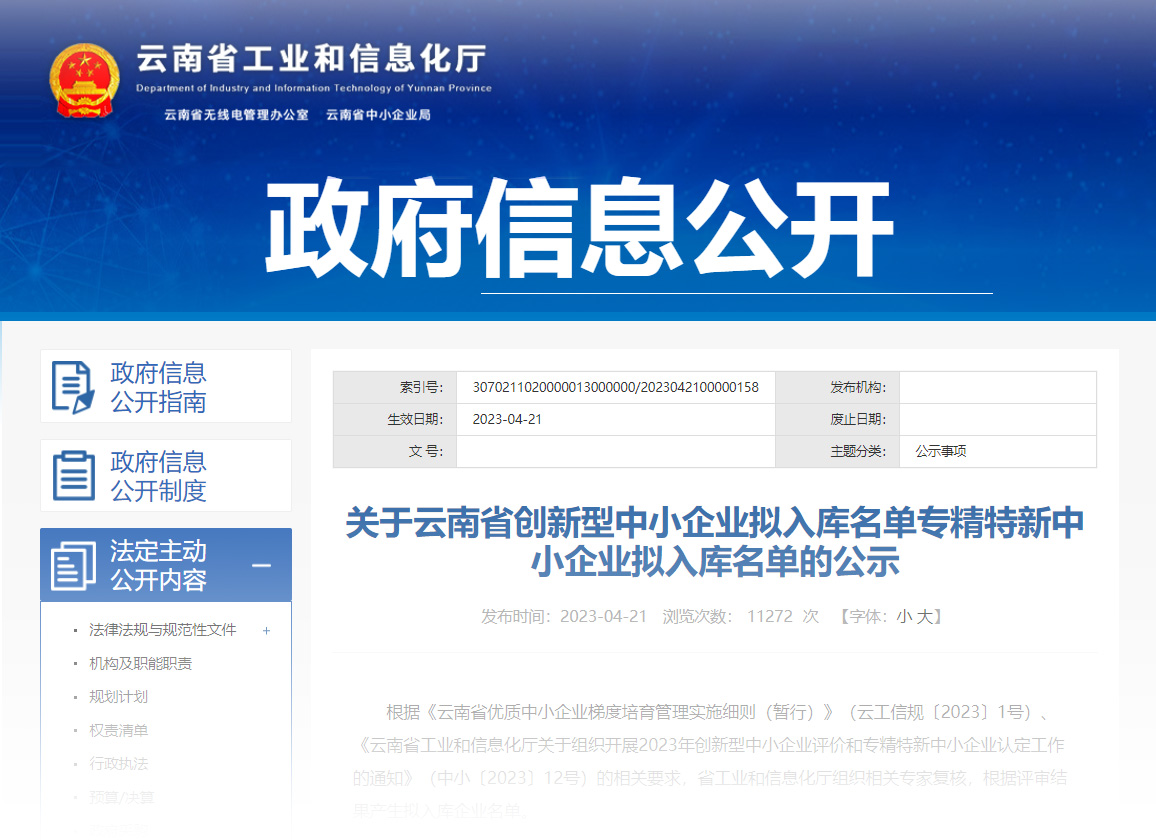 根據《云南省優(yōu)質(zhì)中小企業(yè)梯度培育管理實(shí)施細則(暫行)》(云工信規〔2023〕1號)、《云南省工業(yè)和信息化廳關(guān)于組織開(kāi)展2023年創(chuàng )新型中小企業(yè)評價(jià)和專(zhuān)精特新中小企業(yè)認定工作的通知》(中小〔2023〕12號)的相關(guān)要求,經(jīng)省工業(yè)和信息化廳組織相關(guān)專(zhuān)家復核,天度集團旗下云南天度軟件系統有限公司入選2023年云南省專(zhuān)精特新中小企業(yè)、云南省創(chuàng )新型中小企業(yè)名單;云南蔚嵐信息技術(shù)有限公司入選2023年云南省創(chuàng )新型中小企業(yè)名單。