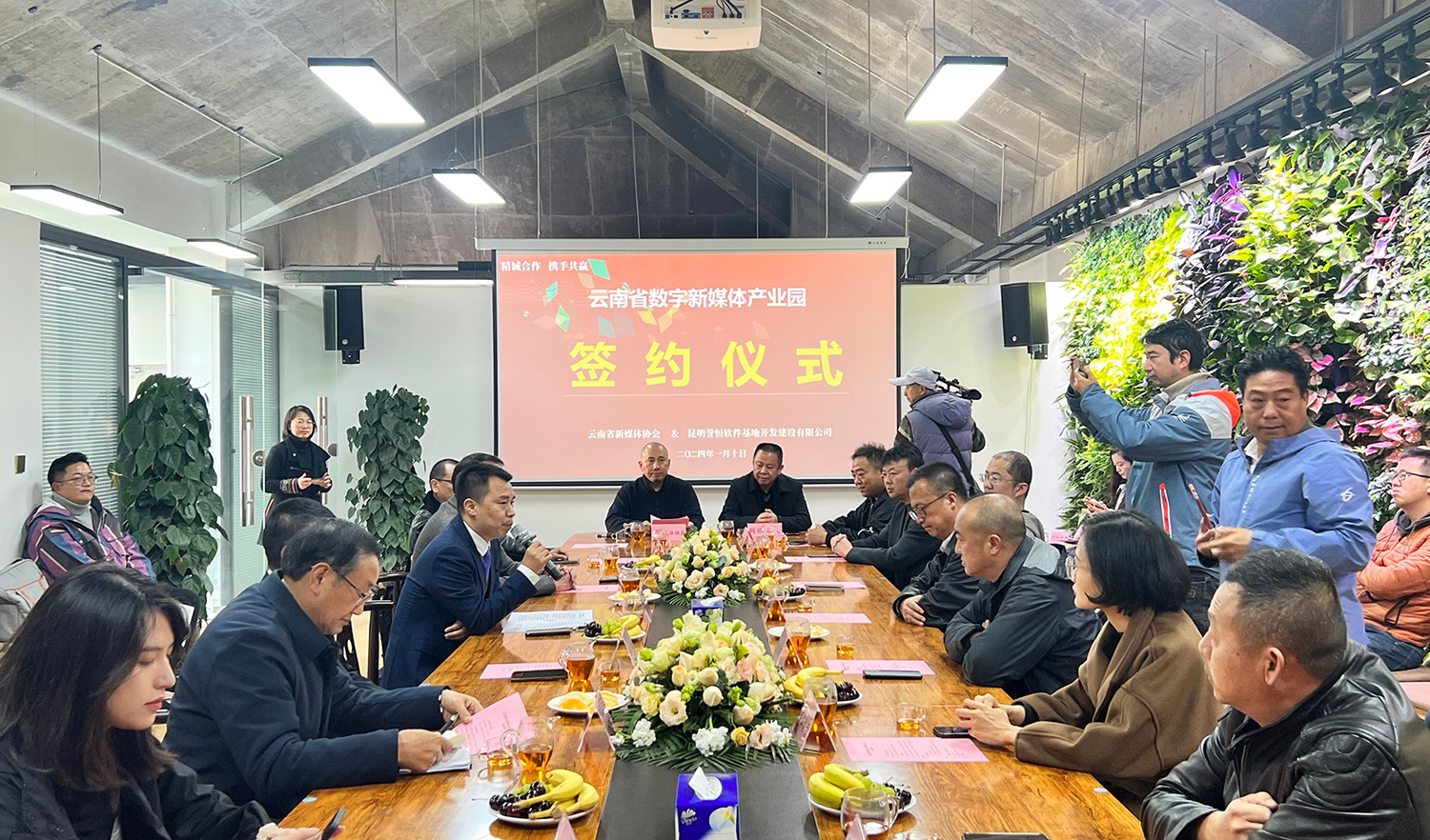 2024年1月10日下午,云南省新媒體協(xié)會(huì )會(huì )長(cháng)鄭桂文與昆明譽(yù)恒軟件基地開(kāi)發(fā)建設有限公司董事長(cháng)周曉東在昆明經(jīng)開(kāi)區簽訂《合作協(xié)議》,雙方將共同建設運營(yíng)“云南省數字新媒體產(chǎn)業(yè)園”,合力打造7.6萬(wàn)平方米規模的數字新媒體產(chǎn)業(yè)集聚區、生態(tài)區、服務(wù)區。