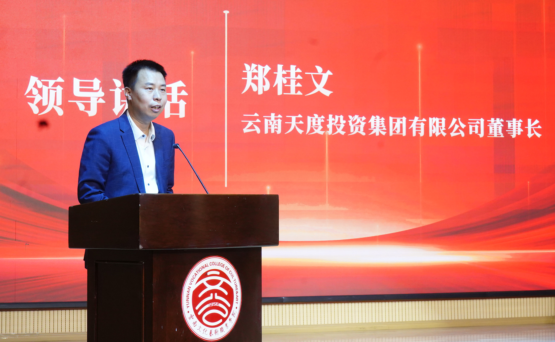 鄭桂文董事長(cháng)在致辭中表示,此次合作是校企雙方貫徹落實(shí)國家職業(yè)教育改革政策、深化產(chǎn)教融合的重要舉措,也是天度集團踐行“以產(chǎn)業(yè)反哺教育、以教育賦能未來(lái)”使命的重要一步。天度集團將發(fā)揮其作為區域數字經(jīng)濟龍頭企業(yè)所擁有大數據研究院、博士后科研工作站等技術(shù)資源優(yōu)勢,以及深耕數字經(jīng)濟20年的產(chǎn)業(yè)優(yōu)勢,與學(xué)校共同聚焦融媒體技術(shù)與運營(yíng)、人工智能技術(shù)應用、軟件技術(shù)、信息安全應用技術(shù)等相關(guān)專(zhuān)業(yè),通過(guò)“共建共管”模式深化產(chǎn)教融合,圍繞數字經(jīng)濟、文旅融合等重點(diǎn)產(chǎn)業(yè)發(fā)展需求,共同建設校內外實(shí)訓基地,克隆企業(yè)真實(shí)研發(fā)環(huán)境,構建專(zhuān)業(yè)集群交叉矩陣,共同制定專(zhuān)業(yè)發(fā)展規劃,定期評估產(chǎn)業(yè)趨勢,動(dòng)態(tài)優(yōu)化課程體系,保持教學(xué)內容與產(chǎn)業(yè)發(fā)展同步,實(shí)現“產(chǎn)業(yè)需求進(jìn)大綱、技術(shù)標準進(jìn)課堂、真實(shí)項目進(jìn)實(shí)訓”,合力打造精準適配市場(chǎng)需求的特色專(zhuān)業(yè)集群,培養數字經(jīng)濟領(lǐng)域高素質(zhì)技術(shù)技能型人才,賦能區域數字經(jīng)濟、文旅融合等重點(diǎn)產(chǎn)業(yè)發(fā)展。鄭董事長(cháng)還強調指出,希望通過(guò)此次合作,雙方將進(jìn)一步推動(dòng)成立產(chǎn)業(yè)學(xué)院并使其成為云南文化藝術(shù)產(chǎn)業(yè)數字化的“創(chuàng )新引擎”,讓每一位學(xué)子在這里找到“用技術(shù)守護文化、用創(chuàng )意點(diǎn)亮人生”的舞臺!共同書(shū)寫(xiě)產(chǎn)教融合的新篇章,為云南乃至全國的數字經(jīng)濟及文旅融合產(chǎn)業(yè)注入新的活力與動(dòng)能!