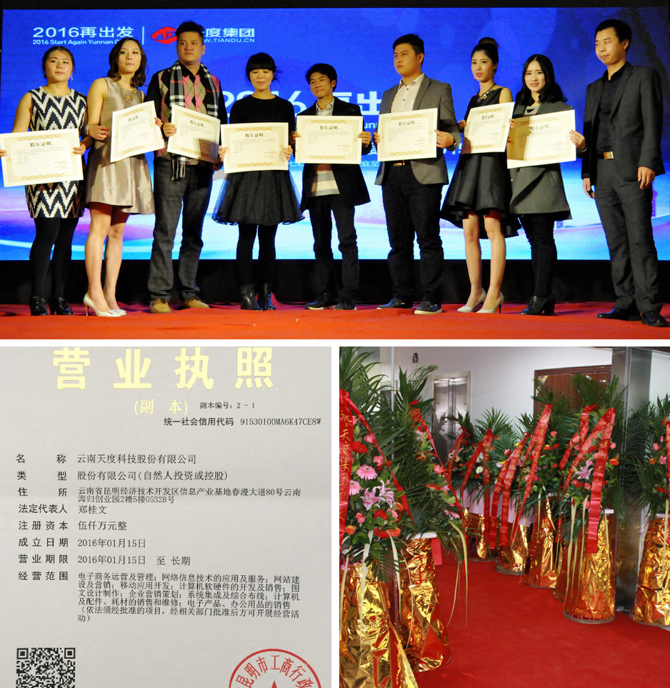 2016年1月28日,云南天度集團董事長(cháng)鄭桂文向所有獲得股份獎勵的員工頒發(fā)了《股權證書(shū)》,并將所有股東、董事、監事提交到云南省工商行政管理局進(jìn)行了正式登記。