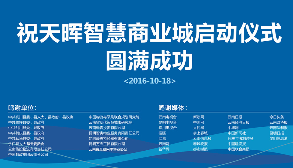 2016年10月18日,由云南天暉投資有限公司、云南天度投資集團有限公司和云南天暉城經(jīng)營(yíng)管理有限公司聯(lián)合推出的“天暉智慧商業(yè)城”在大理賓川正式啟動(dòng)。2017年1月19日,天暉城O2O眾創(chuàng )空間落戶(hù)賓川,大理州委常委、賓川縣委岳黎松書(shū)記、縣政府楊澤亮縣長(cháng)、縣人大張成良主任、縣政協(xié)文慧君主席等相關(guān)領(lǐng)導及縣各部委辦局負責人參加了本次活動(dòng)。