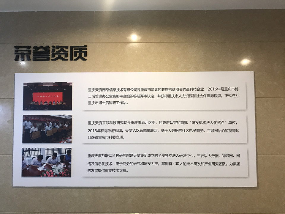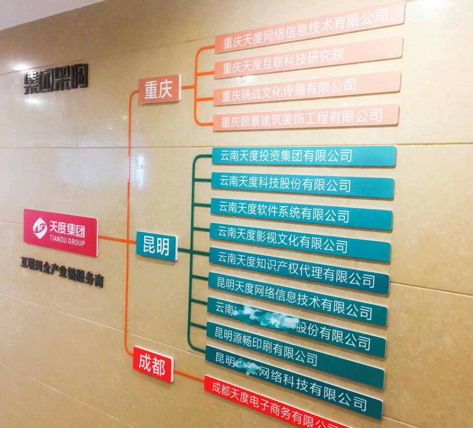 集團概況的文化墻對面就是咱們天度更詳細的“集團架構”,分別羅列出了重慶、昆明、成都三個(gè)總部的子公司,讓客戶(hù)對天度集團名下的子公司有更深入的認識,也從正面證明了天度12年積累下來(lái)的傲人的成果。