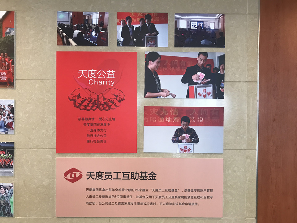 每一分榮譽(yù)證書(shū)的背后,都離不開(kāi)為集團默默付出的員工。天度集團也珍視每一位員工,特別在集團內部設立“天度公益”,一個(gè)只屬于天度員工的互助基金,賬戶(hù)管理由全體員工投票選出三位同事?lián)?,當公司員工及家屬發(fā)生重病或災害時(shí),可以直接向該基金申請救助!