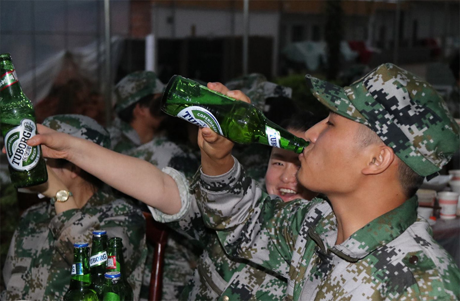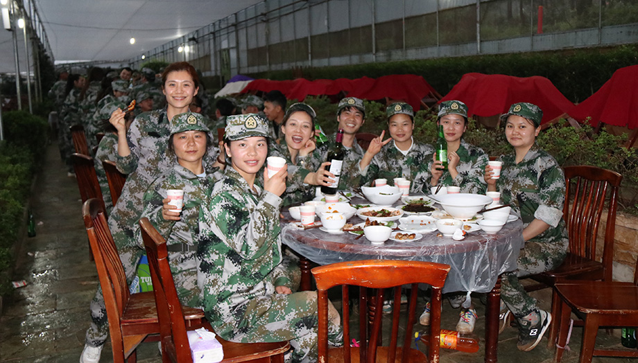 下午訓練結束集合的時(shí)候,教官突然宣布說(shuō)晚上有聚餐,大家頓時(shí)像炸開(kāi)鍋一樣的,畢竟我們這兩天吃盒飯吃得眼睛都要冒綠光了,能在這么艱苦的時(shí)候有一桌大肉吃,真的讓大家有一種撿到錢(qián)的幸福感。晚餐的氣氛異?;钴S,行政部妹紙們也貼心地給大家準備了酒水助興。