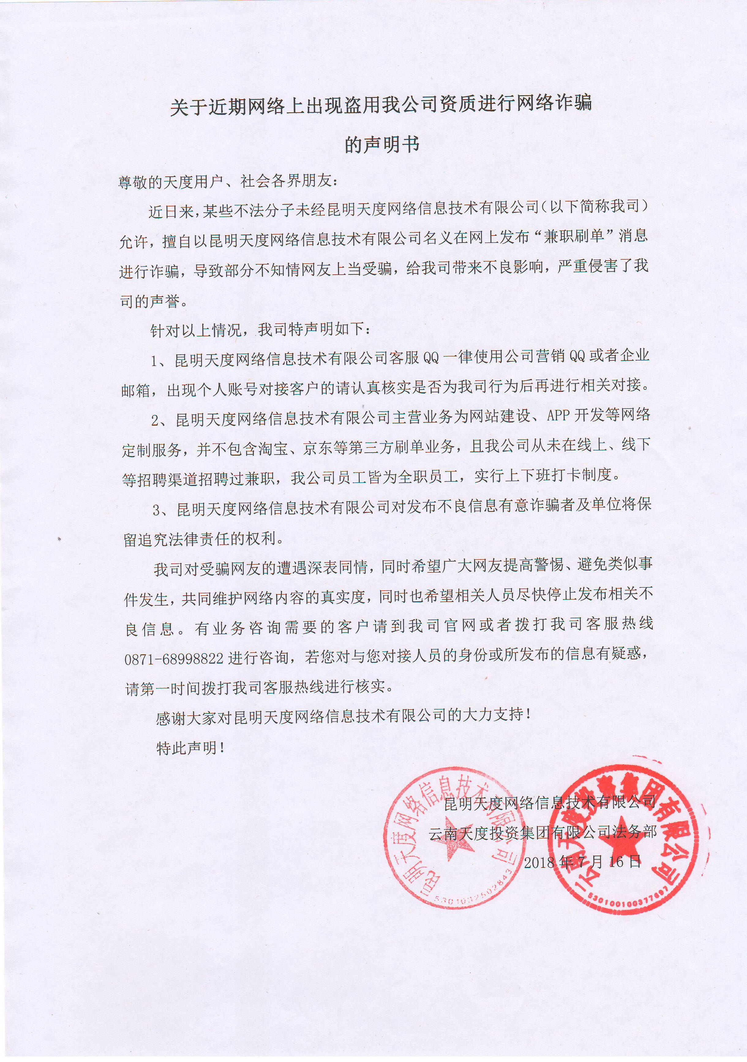 關(guān)于網(wǎng)絡(luò )上盜用我公司資質(zhì)進(jìn)行網(wǎng)絡(luò )詐騙的聲明