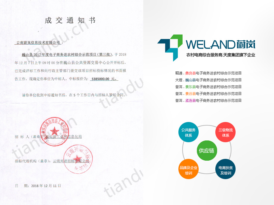 祝賀天度集團旗下“云南蔚嵐信息技術(shù)有限公司”中標景東縣、景谷縣、孟連縣等三個(gè)縣的電子商務(wù)進(jìn)農村綜合示范項目,目前云南蔚嵐信息技術(shù)有限公司已經(jīng)為昭通市彝良縣、大理州巍山縣、普洱市景東縣、普洱市景谷縣、普洱市孟連縣等5個(gè)縣提供了國家電子商務(wù)進(jìn)農村綜合示范縣項目的服務(wù)。
