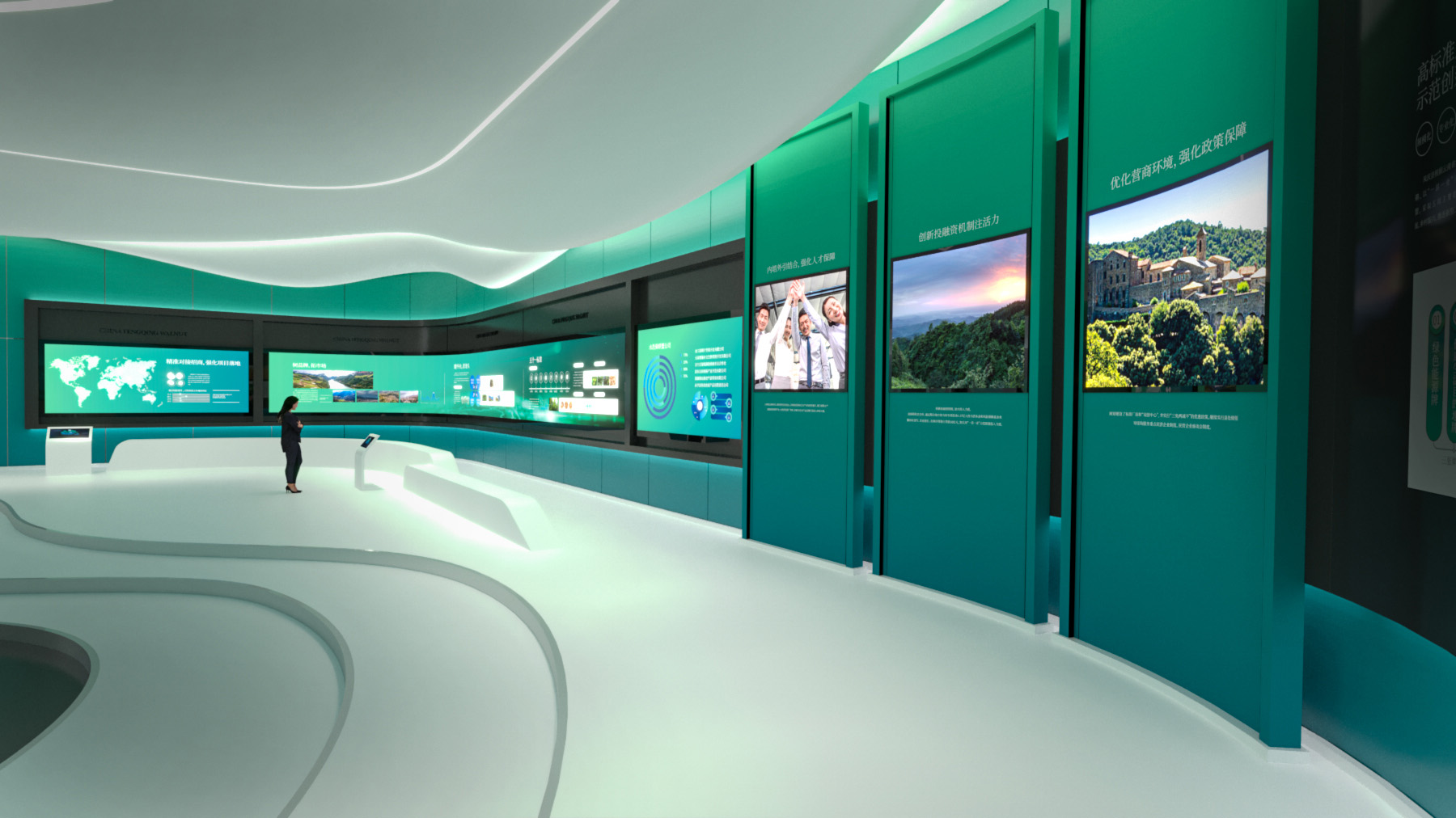 數字沙盤(pán)的運用能夠將企業(yè)的空間布局和發(fā)展規模都生動(dòng)形象的表現出來(lái),能夠讓觀(guān)眾一目了然,展示效果直觀(guān)有震撼力。數字展廳要傳達什么內容和信息,需要通過(guò)鮮明的主題來(lái)展示給觀(guān)眾,因此,在進(jìn)行展廳設計之前,必須對主題定位準確,通過(guò)相應的焦點(diǎn),再配合適當的色彩、圖標與裝飾,以協(xié)調一致、突出重點(diǎn)的方式來(lái)達到傳遞;設計材質(zhì)選擇時(shí)不宜太過(guò)于古板,也不適合選擇過(guò)于跳躍性的顏色,無(wú)論是顏色抑或是數字展廳主要材質(zhì)都要讓人感覺(jué)到大氣、高雅、莊重,因此要選擇合適的顏色來(lái)裝飾展廳;設計可以靈活運用多媒體展項,靈活運用各類(lèi)多元化的展示技術(shù),采用聲光電結合硬裝造型來(lái)提升參觀(guān)者體驗,避免枯燥乏味傳統展廳展示形式,影響整體品位和形象。