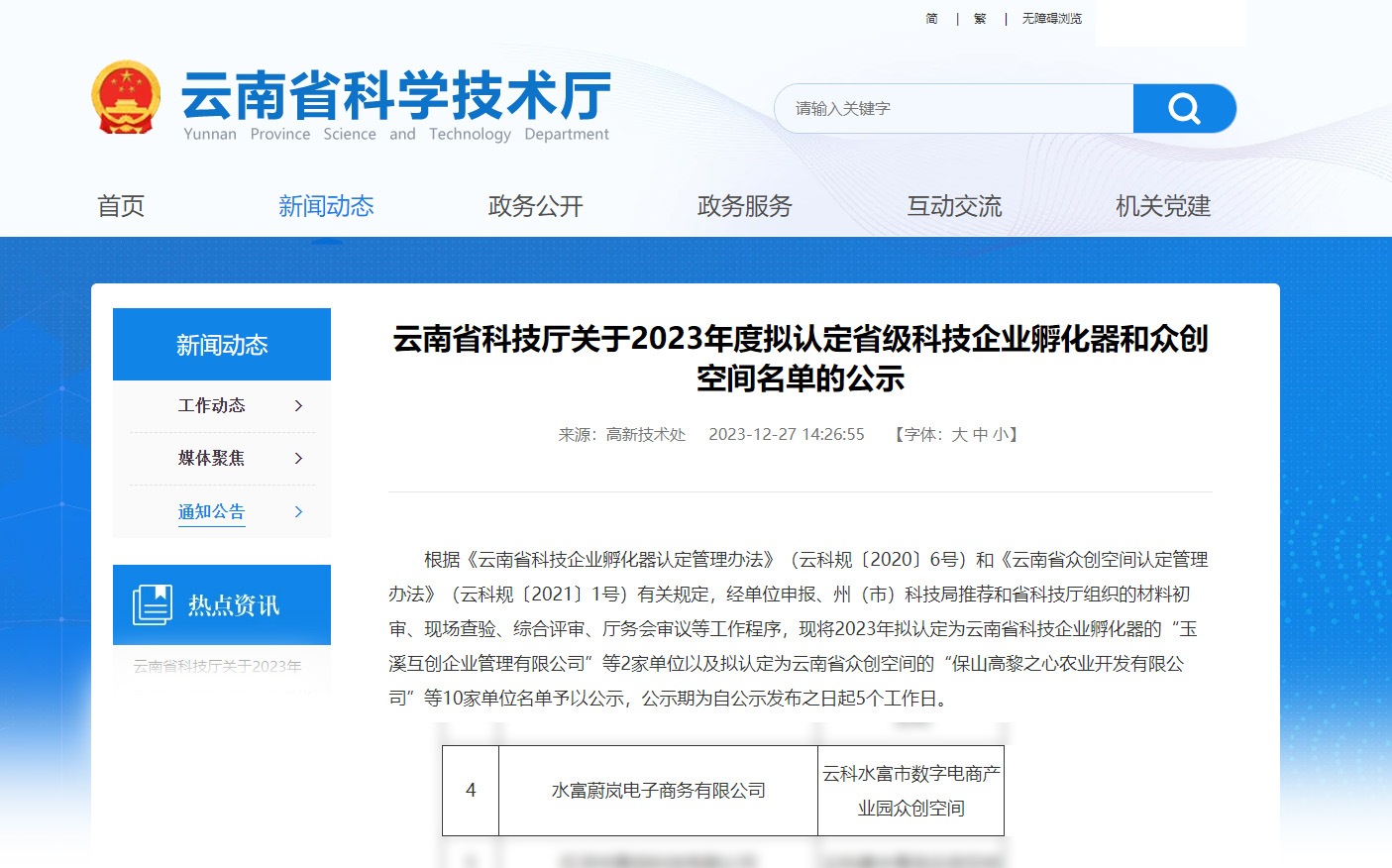 根據《云南省科技企業(yè)孵化器認定管理辦法》(云科規〔2020〕6號)和《云南省眾創(chuàng )空間認定管理辦法》(云科規〔2021〕1號)有關(guān)規定,經(jīng)單位申報、州(市)科技局推薦和省科技廳組織的材料初審、現場(chǎng)查驗、綜合評審、廳務(wù)會(huì )審議等工作程序,天度集團旗下水富蔚嵐電子商務(wù)有限公司獲“省級眾創(chuàng )空間”認定。目前公司已獲得昭通市科技局“昭通市數字電商科技企業(yè)孵化器”、省工信廳“2022年度中小企業(yè)公共服務(wù)示范平臺”等多項認定和榮譽(yù)。