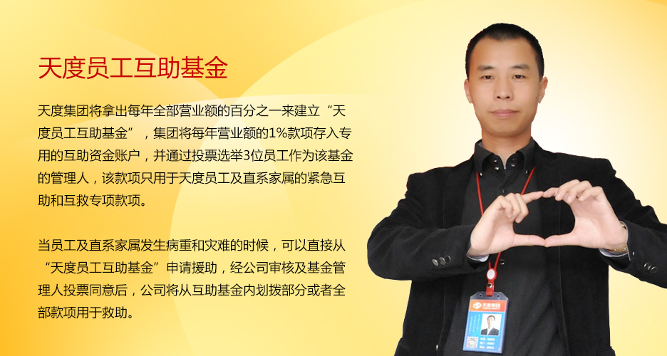 當員工及直系家屬發(fā)生病重和災難的時(shí)候,可以直接從“天度員工互助基金”申請援助,經(jīng)公司審核及基金管理人投票同意后,公司將從互助基金內劃撥部分或者全部款項用于救助。