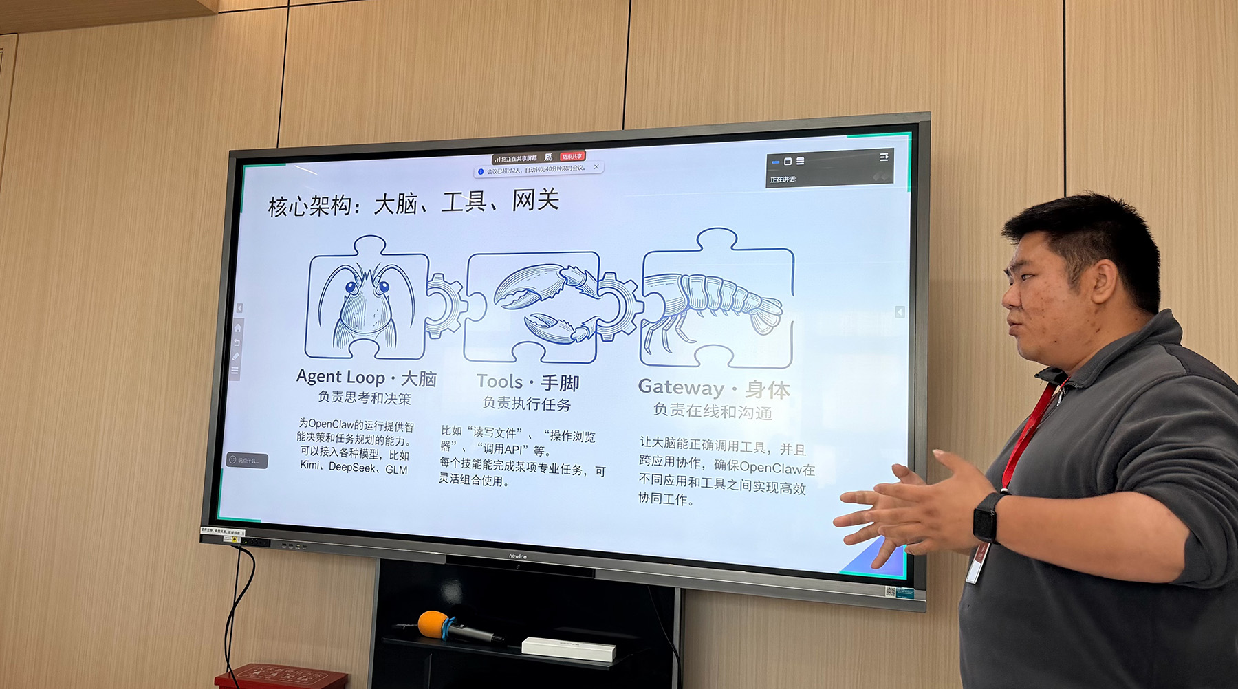 此次全員培訓(xùn),正是集團(tuán)將AI戰(zhàn)略從“高層關(guān)注”推向“全員落地”的關(guān)鍵一步。培訓(xùn)會(huì)由集團(tuán)高級(jí)工程師楊帥主講,他結(jié)合精心準(zhǔn)備的PPT,深入淺出地講解了OpenClaw與大語(yǔ)言模型的本質(zhì)區(qū)別、核心架構(gòu)、多種部署方式,并通過訂單拆分、物流合并、數(shù)據(jù)分析、記憶陪練等真實(shí)業(yè)務(wù)場(chǎng)景的現(xiàn)場(chǎng)演示,生動(dòng)展現(xiàn)了AI從“只能動(dòng)嘴”到“真正動(dòng)手”的能力躍遷。